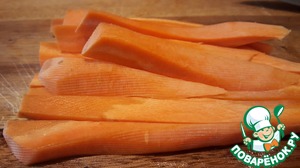 Морковь нарезать крупными брусочками. Белую часть лука порея и начало зелёной части нарезать на 4 части и по длине примерно как бруски моркови. Включить разогрев духовки 200*.