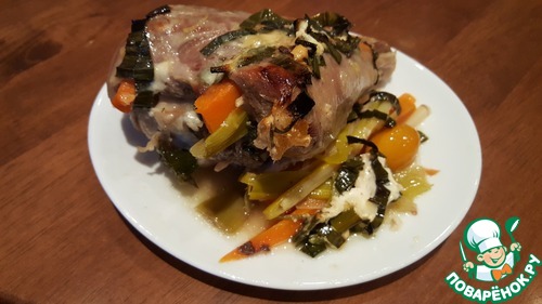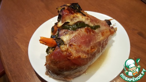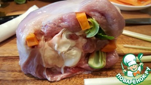 Вымыть голени индейки. Снять с них кожу и обсушить голени. Нашпиговать каждую голень морковью с луком пореем и листиками мелиссы. Удобно нашпиговывать голени, делая надрезы длинным тонким ножом.