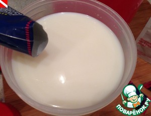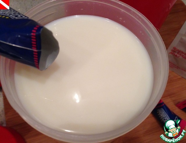 Добавляем содержимое пакетика (3 г) бактериальной закваски Oursson, очень хорошо размешиваем, чтобы закваска полностью растворилась.