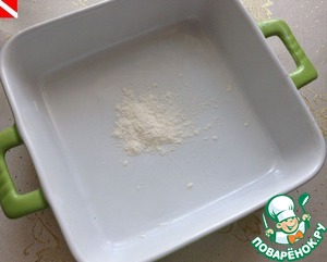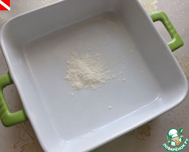 Форму для выпечки (размер 19*19 см) смазать маслом и обсыпать мукой. Духовку разогреть до 185 градусов.