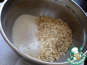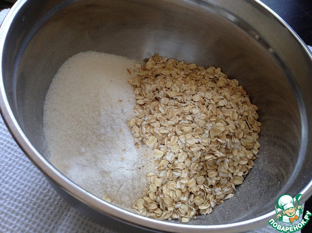 В миску просеять муку с разрыхлителем. Добавить соль, сахар, овсяные хлопья. Перемешать.