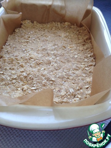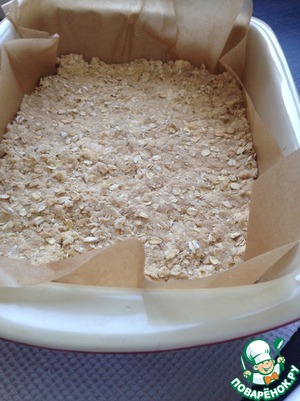 Форму застелить бумагой для выпечки так, чтобы края бумаги свисали на 2-3 см. Выложить на дно формы 2/3 мучной крошки. Равномерно распределить по дну и слегка придавить руками.