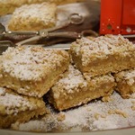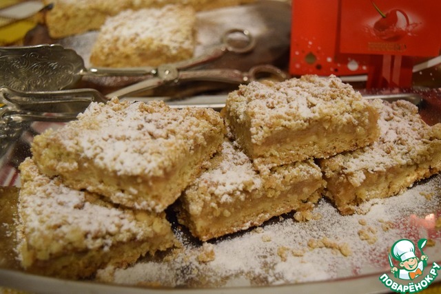 Поверх крошки выложить яблоки (можно присыпать корицей). Присыпать яблоки оставшейся крошкой.