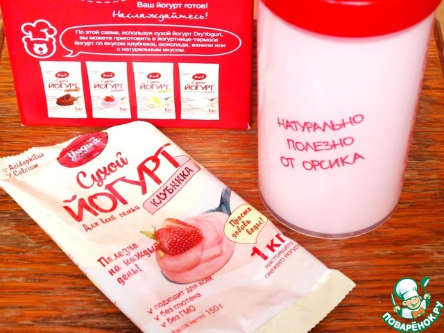 В 850 мл. воды комнатной температуры высыпать при постоянном помешивании сухой йогурт в дозировке 150 гр. Тщательно перемешать в течении 2-3 минут, визуально убедившись в отсутствии комочков. Поставить получившуюся молочную смесь в теплое место (35-40 градусов) на 6-10 часов для сквашивания (я использовала йогуртницу-термос OURSSON.). После убрать йогурт в холодильник для охлаждения. Получился очень вкусный йогурт с приятной консистенцией и насыщенным клубничным вкусом. Из полученного йогурта я буду готовить клубничный тарт.