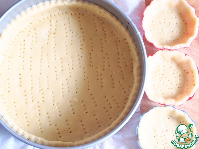 Тесто распределить в разъемной форме (диаметр 22 см), застеленной пергаментом и смазанной растительным маслом, сформировав бортики. У меня еще осталось тесто на 3 корзиночки. В тесте сделать частые наколы вилкой, чтобы при выпечки оно не вздувалось. Отправить в духовку, заранее разогретую до 180 гр., на 15 - 18 минут (корзиночки на 10) до легкого румянца.