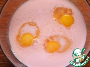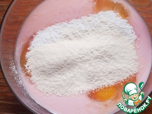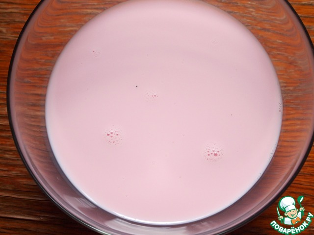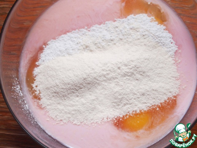 Пока выпекатется основа, приготовим начинку. В емкость вылить приготовленный клубничный йогурт (450 мл.).