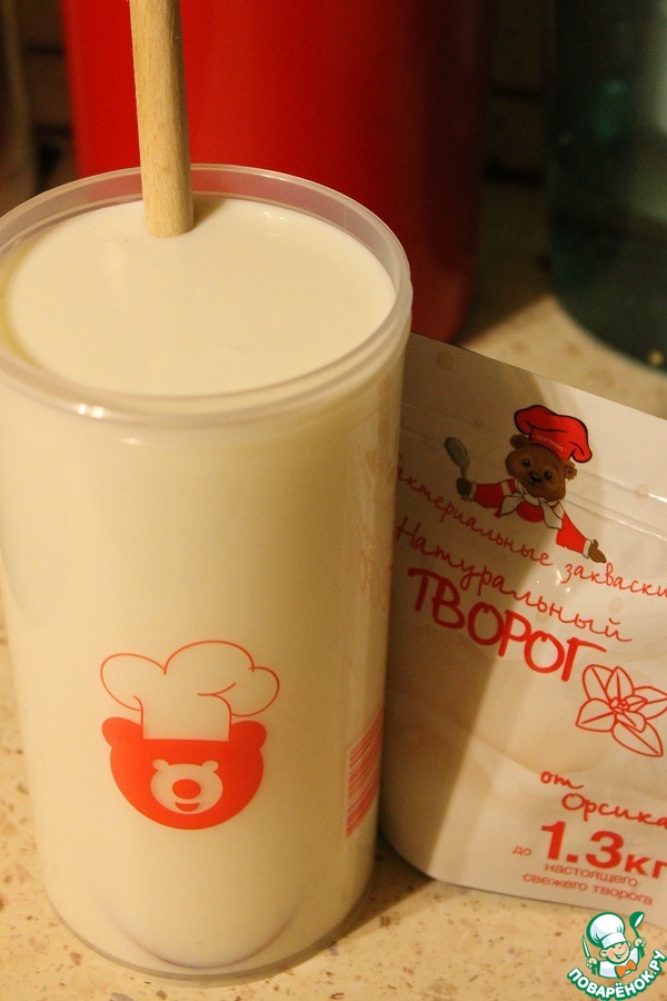 Мешать чистой сухой ложкой в течении 2х минут, до полного растворения закваски. Емкость накрыть крышкой и поставить в термос-йогуртницу (35-40 градусов) на 10 часов для сквашивания.