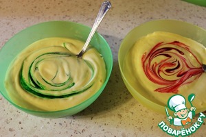 Разделить тесто на две равные части. В одну часть добавить красный краситель, в другую - зеленый.