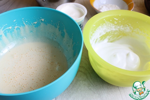 Ну и в конце, смешаем желтки со сметаной, далее добавим белки и всыпаем сухие ингредиенты. Все это делаем деликатно.