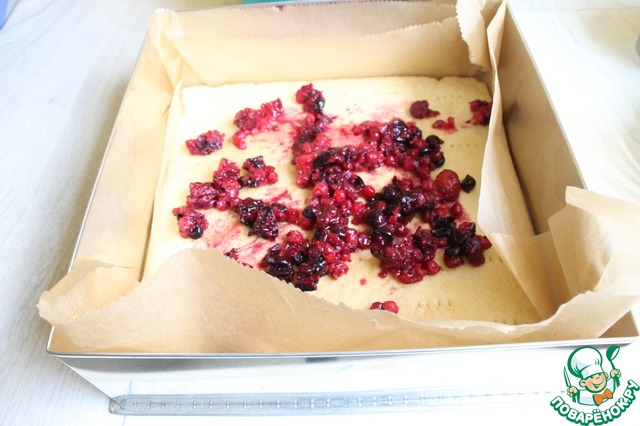 Достаем наше тесто из морозилки, выпекаем его в разогретой духовке до 160 градусов 25 минут, до золотистого цвета. Выкладываем сразу наши ягоды.