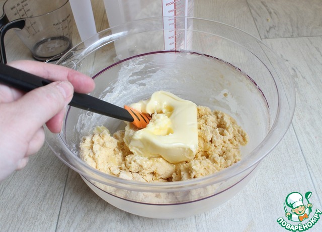 Далее добавим к тесту мягкое масло, все перемешиваем и добавляем остaвшуюся муку с разрыхлителем.