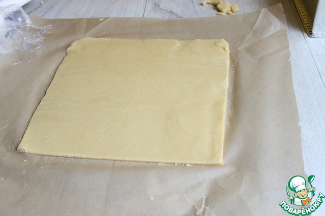 Тесто раскатываем на бумаге в пласт толщиной 0,5 см через пленку. Так оно не прилепает. И вырезаем квадрат по размеру вашей формы или рамки.