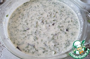 Приготовим соус из Мацони. Зелень мелко рубим. Её должно быть много, чтобы соус был густой и ароматный. Чеснок пропускаем через пресс.