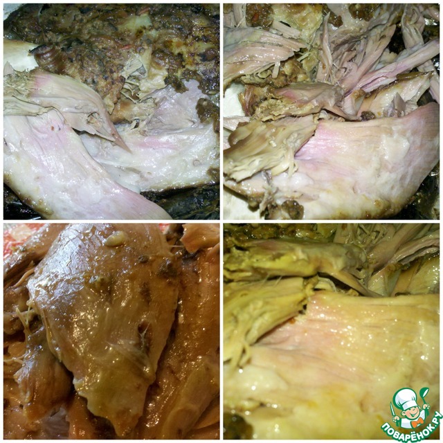 Затем, достаём опять форму, уменьшаем огонь до 190 градусов, переворачиваем ещё раз ногу (в этот момент можно воткнуть в мясо термометр для запекания, если таковой имеется) и запекаем уже 40 минут.