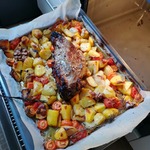 На следующий день, в форму для запекания положить хорошо промытый щеточкой, под проточной водой, целый не чищенный картофель, помидоры, нарезанные на 2 части (или на 4, если томаты крупные), целые луковички без шелухи, чищенную и крупно нарезанную морковь, очищенные зубчики чеснока. Овощи посолить, полить оливковым маслом, перемешать, полить сверху 2 ст. л. белого вина.