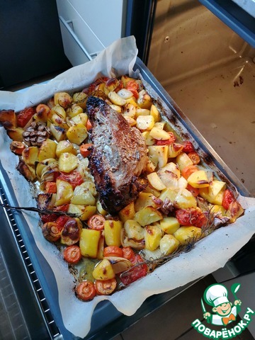 Мясо нарезать и подавать с овощами, полив образовавшимся соком из противня.