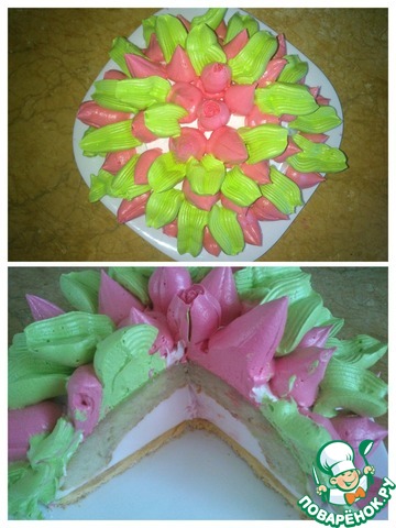 Крем у меня мокрое безе по рецепту Светланы. Готовиться очень просто и результат потрясающий. У меня на крем ушло 1. На обмазку торта 2 белка. 2. на цветы 4 белка. 3. на листики 1 белок. Для каждой позиции я отдельно готовила крем. Так как мне показалось что приготовить крем сразу из 7 белков будет достаточно трудно. Но так, как крем готовиться просто и быстро, трудностей мне готовить его в три подхода не составило труда.