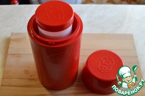 В контейнер от термоса, наливаем воду комнатной температуры, высыпаем пакет сухого йогурта и встряхиваем очень тщательно до полного растворения порошка.