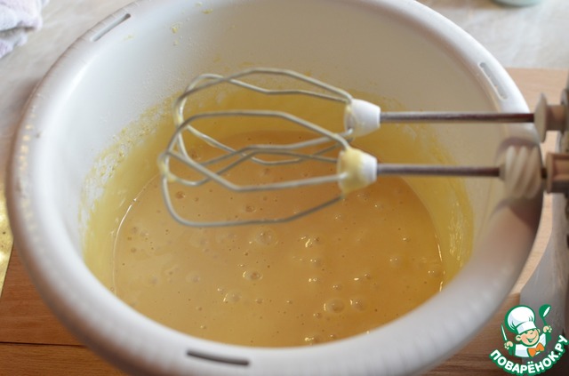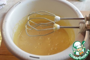 Готовим бисквит. Яйца необходимо хорошо взбить миксером, добавить сахар и еще раз взбить. добавить сливочное масло комнатной температуры, йогурт, муку и соду и еще раз хорошо взбить до однородной консистенции.