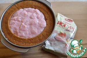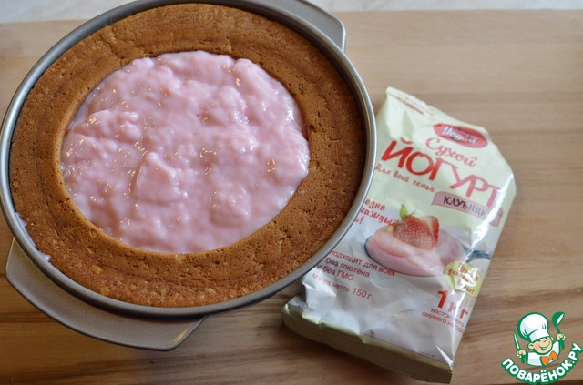 Когда желатин набухнет, распустите его при помощи микроволновой печи или на плите, тут как кому удобно. Вылейте его в 700 мл йогурта и хорошо перемешайте, саму смесь вылить в полученное пространство при выпечки бисквита. Убрать в холодильник до полного застывания.