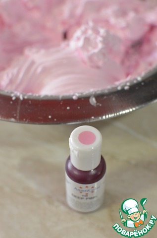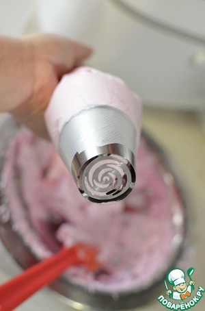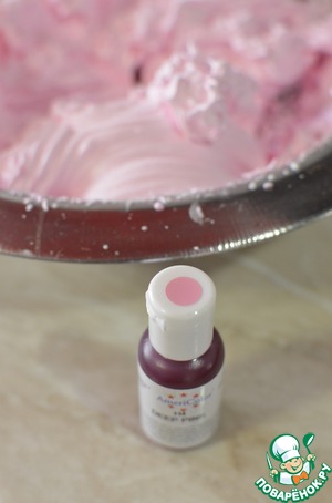Приготовить крем для цветов. Крем я подкрашивала гелиевыми красителями розового цвета.