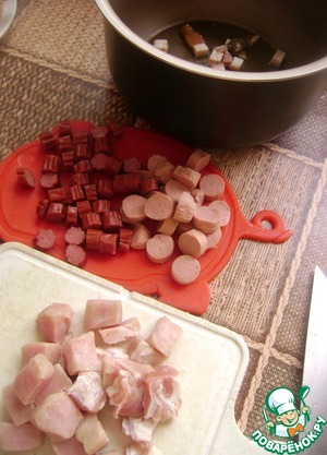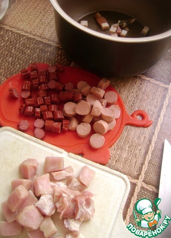 Нарезать мясные продукты кубиками, мясо немного крупнее готовых продуктов.