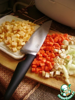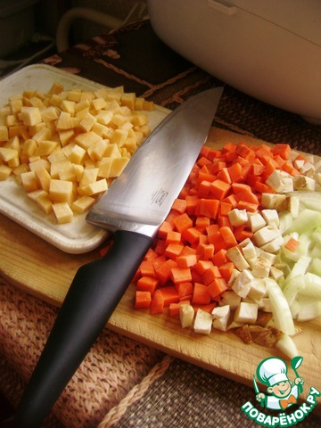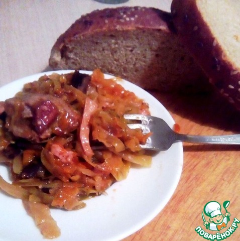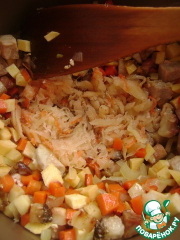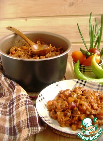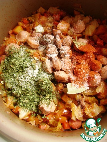 Перемешать хорошо, влить 100 мл воды и добавить нарезанную некрупными квадратиками свежую капусту. Добавить пряности, посолить. Закрыть крышку и установить режим тушения, время – три часа. Не пугайтесь, готово будет намного раньше, просто такой прием поможет понизить температуру приготовления и томить блюдо, даже если в вашей мульте не предусмотрен режим томления или регулировка температуры.