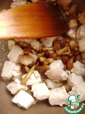 Разгрести середину чаши и выложить туда квашеную капусту. Жарить 3-4 минуты.