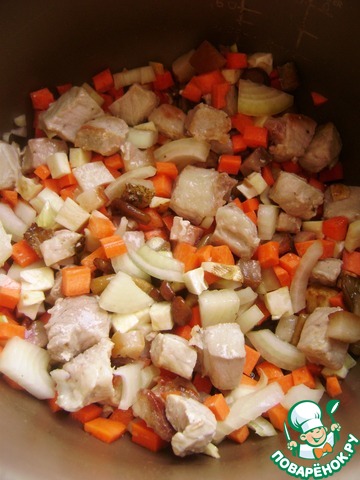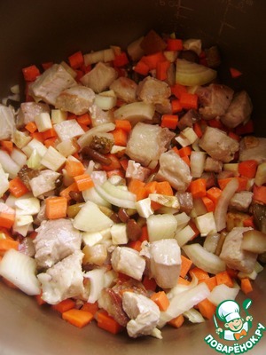 В чашу мультиварки налить масло, выложить бекон и свинину и обжарить до легкой корочки. Готовить следует на режиме жарка, под крышкой, изредка перемешивая содержимое.