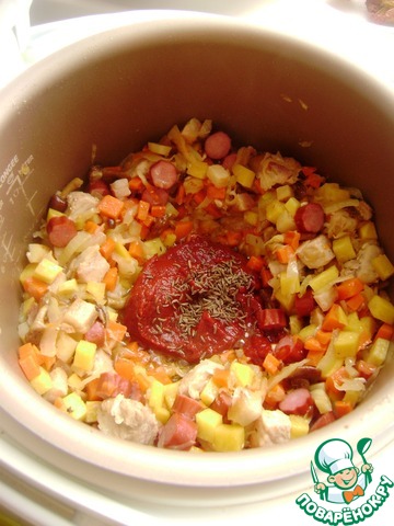 Перемешать и снова освободить середину чаши. Выложить туда томатную пасту, посыпать сахаром и тмином и прогреть под крышкой пару минут.