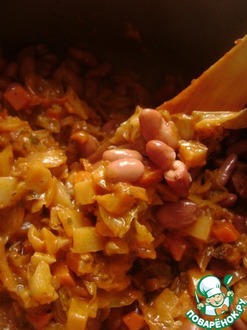 Через 5 минут перемешать осевшую капусту и продолжить тушить 15 минут. Затем добавить в айнтопф вареную фасоль и сметану, посыпать черным перцем, аккуратно перемешать, попробовать на соль. Закрыть крышку и тушить еще 10 минут. Затем перевести мультю в режим сохранения тепла минут на 15.