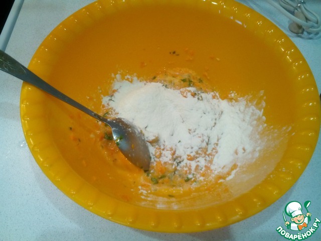 • Далее добавляем муку в овощную смесь с яйцом=>