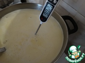 После внесения сычужного фермента ждем образования сырного сгустка. Время зависит от кол-ва фермента, его свежести, а так же от качества и температуры молока. У меня это заняло около 35-40 минут.