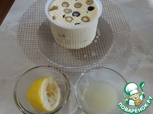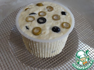 Как только почувствуем, что появляется некая тянучесть и активное склеивание сгустков, быстро выбираем сырное зерно в форму для сыра, пересыпая колечками нарезанных оливок. Массу немного придавливаем ладонью, уплотняя сыр.