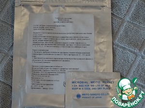 - Сычужный фермент ( Meito или другой сычужный фермент согласно инструкции) — 1/10 пакет.