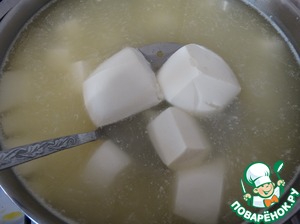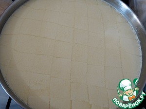 Полученный сгусток нарезаем на квадраты со стороной 1.5-2 см. Аккуратно перемешиваем шумовкой, разрезая большие куски, если такие находятся. Стараемся размешивать медленно, не разрушая сгустки.