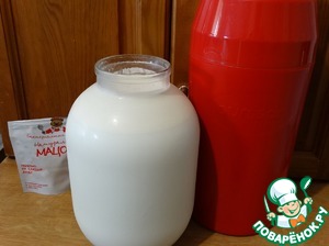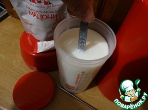 Для начала получим мацони. Нагреем 1 л молока до 40 градусов - наиболее благоприятную для старта термофильных бактерий. Перельем в стакан для сквашивания, добавим сухую закваску "Мацони" от Орсика, тщательно размешаем и поместим в специальный термос, в который добавим воду, температурой 100 градусов. Термос плотно закроем и поставим в теплое место на 6-10 часов.