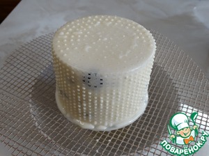 Затем сыр вынимаем из формы, обсыпаем солью, втирая ее со всех сторон, вкладываем обратно в форму и оставляем в таком виде на 6-8 часов, затем помещаем в холодильник, вынув из формы, на дренажном коврике. Время от времени переворачиваем сыр, чтобы он подсох равномерно и удаляем влагу, если она появится. -