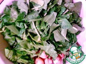 Потом смешиваем все ингредиенты. Не забываем посолить. Добавляем оливковое масло.