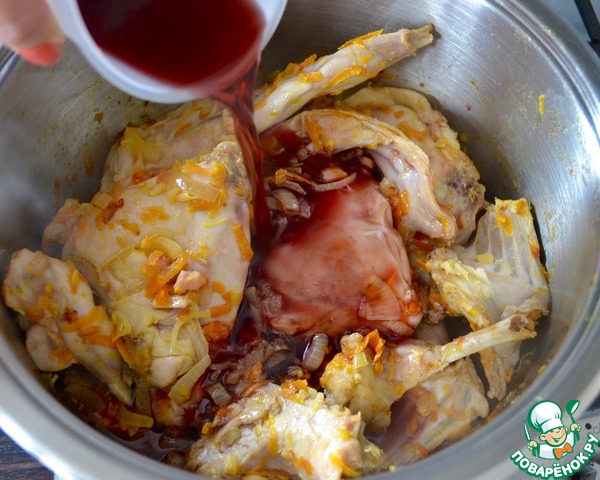 Накрыть кастрюлю крышкой и тушить кролика в соусе 1 час на слабом огне.