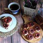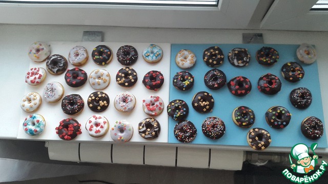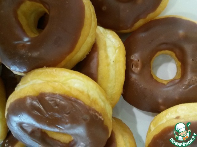 Обмакиваем верх пончиков в глазурь, даём глазури немного подсохнуть и подаём угощение к столу.