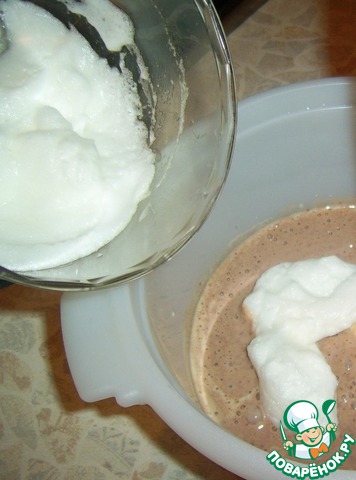 Добавляем взбитые белки, натертый на мелкой терке шоколад и ложкой осторожно перемешиваем нашу смесь для мороженого.
