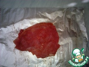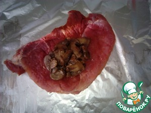 Из фольги вырезать квадратные заготовки 25х25см. Выложить на фольгу отбивные ломтики мяса, на них выложить грибы. -