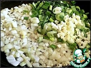 В этой же сковороде обжарить измельченный лук до мягкости, добавить мелко порезанный чеснок, зелень и зеленый лук.