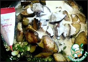 Далее добавить баклажаны, налить домашний натуральный мацони от фирмы Orsik, посолить, поперчить и перемешать.