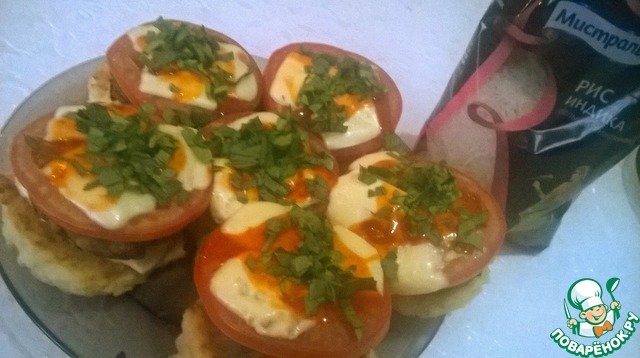 на рисовую котлетку кладем кусочек сыра, затем мясную котлетку, тонкий кусочек помидора и снова сыр