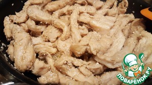 Филе куриной грудки промыть, обсушить и нарезать тонкими длинными полосками.