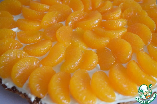 На первый корж наносим немного крема и раскладываем дольки мандарин. -