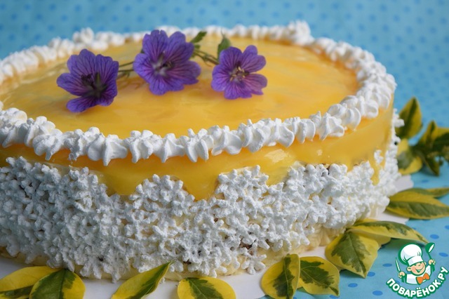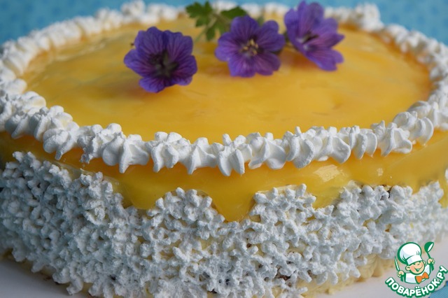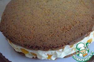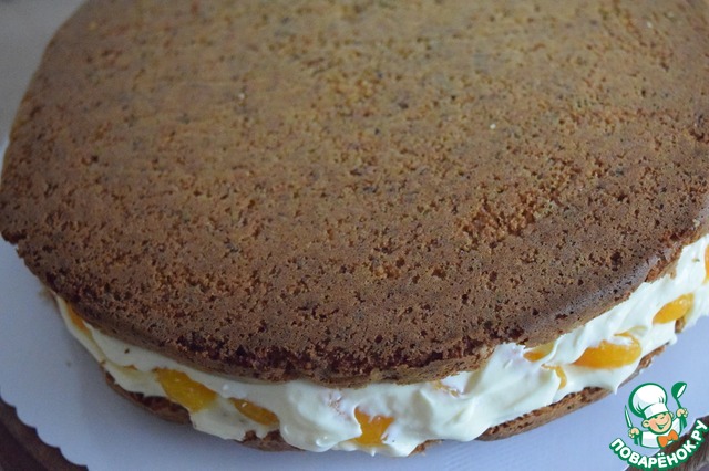 На мандарины вновь наносим половину крема и накрываем вторым коржом.