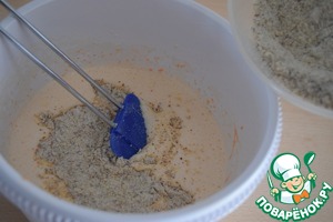 Сухой порошок пудинга разводим небольшим количеством апельсинового сока. Желатин замачиваем в отдельной посуде. -